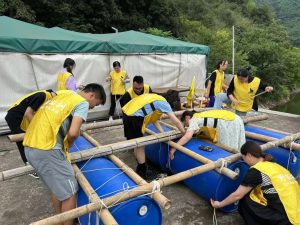 午餐過后,大家來到了青沐寨露營地,進行一場“扎筏泅渡”的戶外比賽。比賽要求每組隊員在特定的時間內,利用所給地毛竹、麻繩、大塑料桶扎出結實的竹筏,隨后乘竹筏抵達目的地?!霸で龆伞表椖矿w現的是個體的利益將與團隊的利益緊緊結合在一起,讓大家在親身體驗的過程中了解群策群力的重要性,也培養了隊員們溝通、學習與統籌的能力。